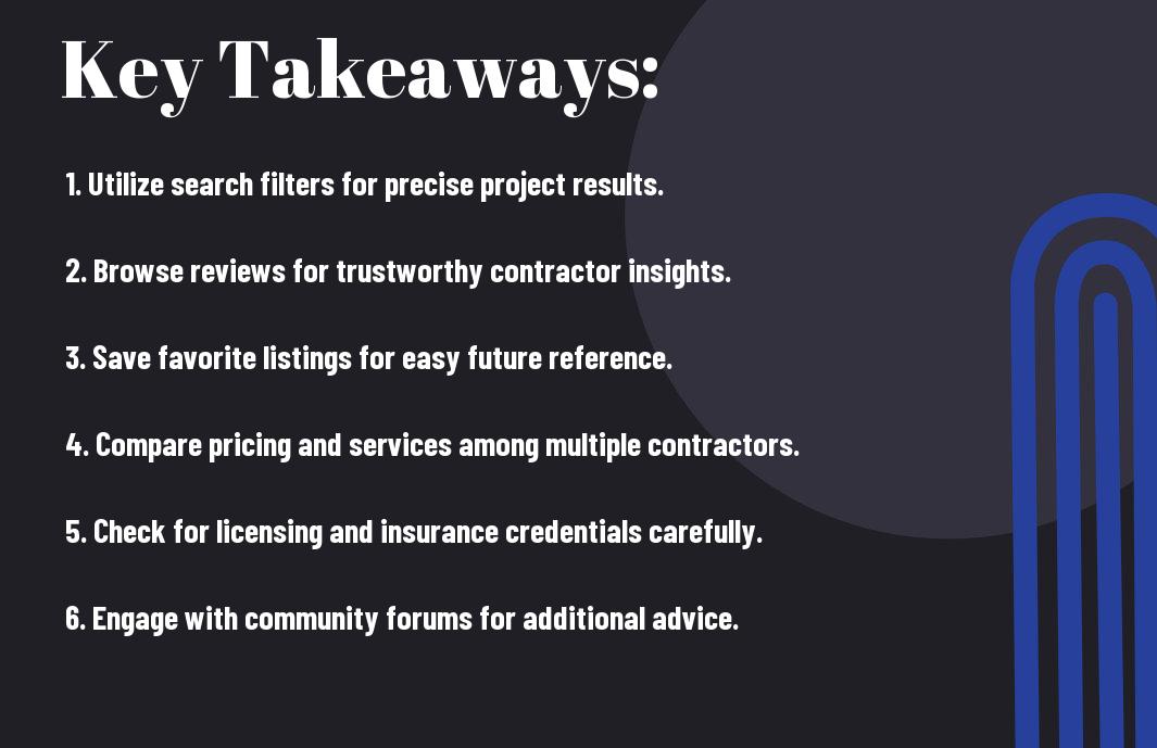 Some effective search queries can significantly enhance your experience in a home improvement directory. By understanding how to formulate your searches, you can quickly yield more relevant results that match your project needs. Be specific about the type of service or product you require to streamline your search and discover the best options available.