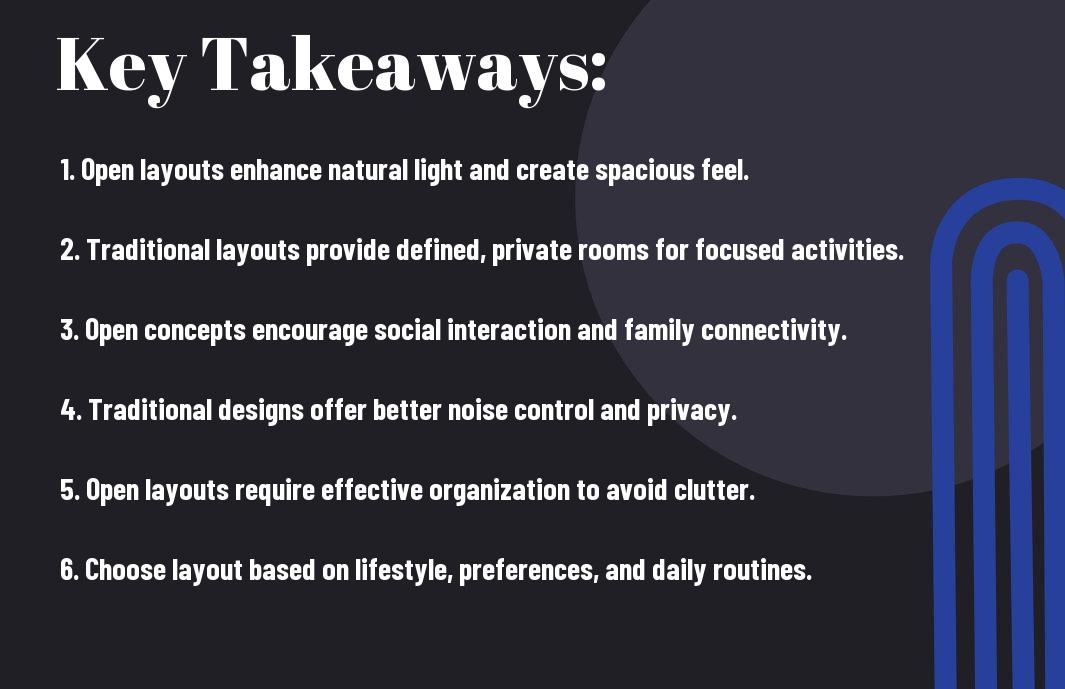 Open-concept designs have gained significant popularity in modern home layouts, catering to those who value spaciousness and a seamless flow between living areas. Yet, traditional layouts offer unique advantages, providing designated spaces that can enhance privacy and functionality. In this blog post, you will explore the key differences between open-concept and traditional layouts, helping you determine which style harmonizes best with your lifestyle, family needs, and personal preferences. Understanding these concepts will empower you to make informed choices for your dream home.